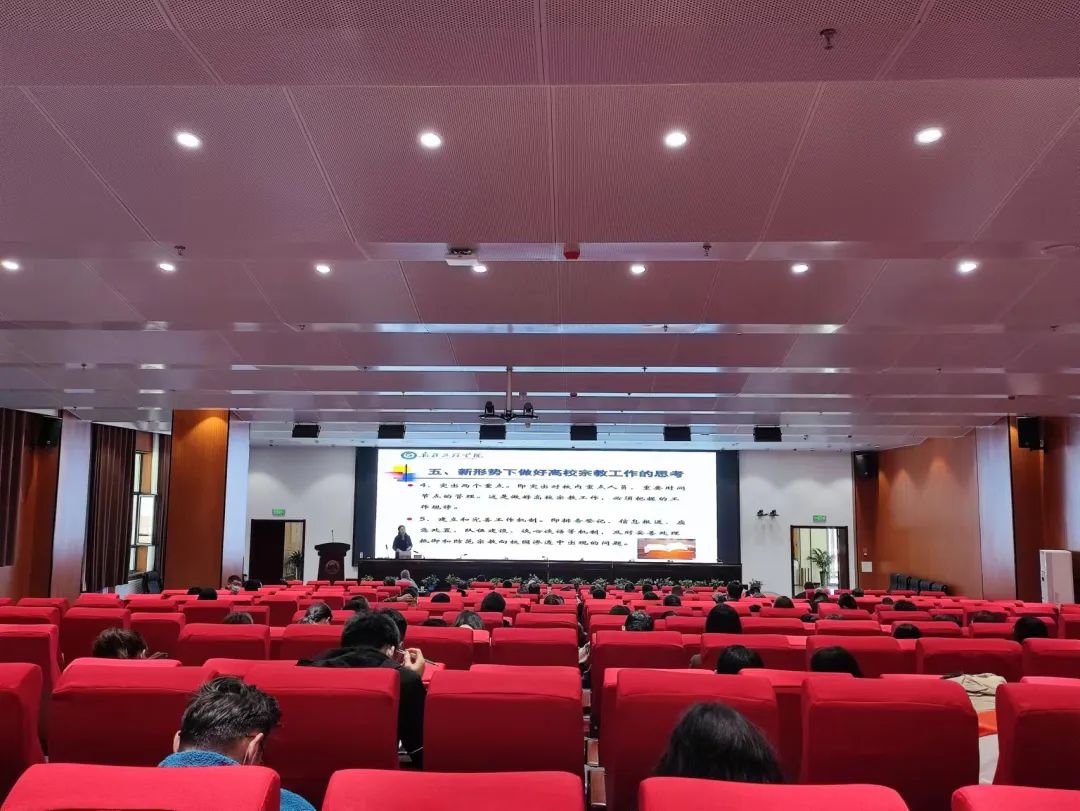 熊新荣教授对党的宗教政策、工作方针、法律法规做了系统全面的阐述,她深入浅出为大家讲解了我国宗教历史的演变发展过程,以深厚的政策理论功底、精辟严谨的论述,阐述了宗教工作在党和国家工作中的特殊重要性。在讨论交流环节,她与现场观众亲切互动,共同探讨如何开展青年学生的思想引领工作,牢牢掌握学校宗教工作的主动权,维护好意识形态阵地,建设和谐、平安校园。