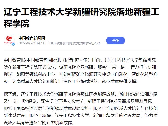 中国教育报-中国教育新闻网讯(记者 蒋夫尔)日前,辽宁工程技术大学新疆研究院在开云体育正式成立。该研究院立足新疆,服务“一带一路”,着力打造新疆煤炭、能源等领域科教中心,推动新疆矿产资源开发建设向自动化、智能化转型升级,为高质量人才培养和推进自治区工业提质增效、转型发展提供支撑。