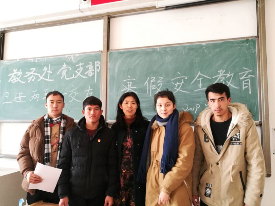 首先,教务处党支部书记张玉珍就学生们放假前集中教育学习进行了进一步总结强化,简明扼要,重点突出的对集中教育内容进行了再学习,增强四个意识,坚定四个自信,坚决做到两个维护。其次,加强对学生寒假期间安全教育。她强调,寒假期间,同学们出行要注意安全,离校前做好三区卫生,加强宿舍安全检查,关好教室宿舍门窗,强化假期安全,增强安全防范意识。三是强化总目标意识,坚决做到两个不得五个严禁,增强大局观念和明辨是非能力,自觉抵制三股势力的渗透,坚决同三股势力和两面人作斗争,积极维护新疆团结和谐稳定好局面。四是主动到社区,村委会,访惠聚工作队报到,服从他们的工作安排,努力工作。积极参加社会实践,自觉给交友老师汇报实践情况。五要增强感恩意识,体贴父母的不易,回家多帮父母做点事,干点活。同时,要教会他们学说国家通用语言,将党的政策和理论宣传给他们,让他们了解国家和自治区的各项惠民政策。自觉践行社会主义核心价值观。六是为进一步提高学生的国家通用语言文字能力,讲好普通话,写好规范字,教务处党支部给每位联系学生留了寒假作业,为每位学生准备了党的十九大精神字帖,并嘱咐他们要加强练习,写好中国字,说好普通话。最后请同学们代问家长好,祝同学们寒假快乐!